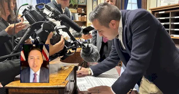 John Anthony Castro, du Texas, signe une affiche commémorative après avoir déposé sa candidature pour être inscrit sur le bulletin de vote républicain pour la primaire du New Hampshire 2024 à Concord, N.H., le mercredi 11 octobre 2023. (AP Photo/Holly Ramer). En médaillon : John Anthony Castro (via YouTube/Larry Sharpe).